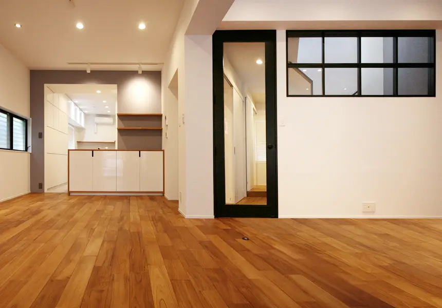 壁や天井は白を基調とし、軽すぎず重すぎないバランスが取れたダークブラウン系のチークフローリングを床一面に敷き詰めることで『落ち着いた上質空間』を作り出しました。