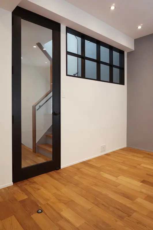 リビング(階段に面する壁に黒の格子窓とガラス框扉)