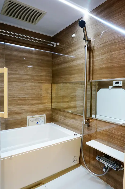 ※ユニットバスの壁はダーク色の石目調。