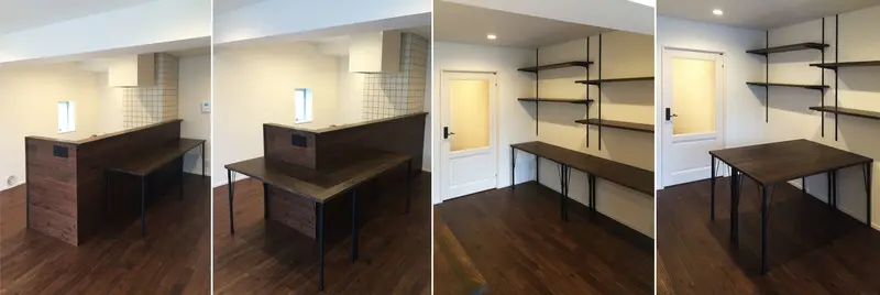内装・プランに合わせて造作した2つの机は置き方を組み合わせることで、デスク・ダイニングテーブル・ダイニングカウンターなどとなり、様々な生活のシーンに対応するように考えました。