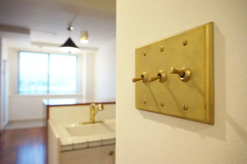※くすんだゴールドの真鍮トグルスイッチ。メカっぽい。