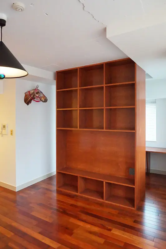 ※造作本棚は床から天井まで高さ約2.6mあり、とても大きい。ワークスペース側は可動棚になっていて高さ調節ができるため使いやすい。