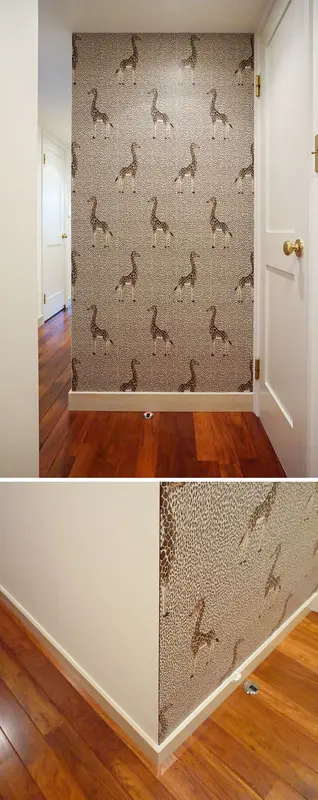 ※玄関を開けた正面にキリン柄の壁紙。石目調の本磨きタイル巾木。