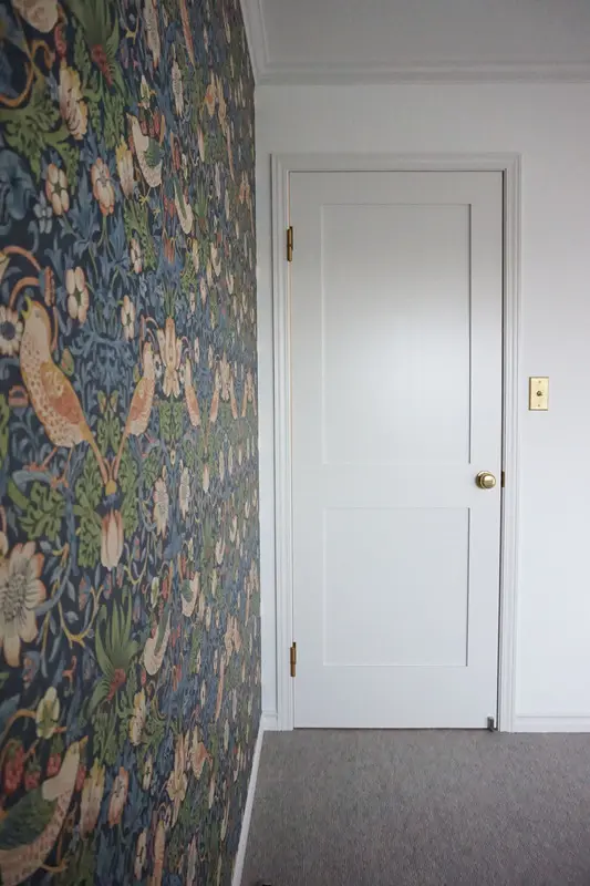 ※寝室。ウィリアムモリスの壁紙と白いツヤあり塗装ドア。