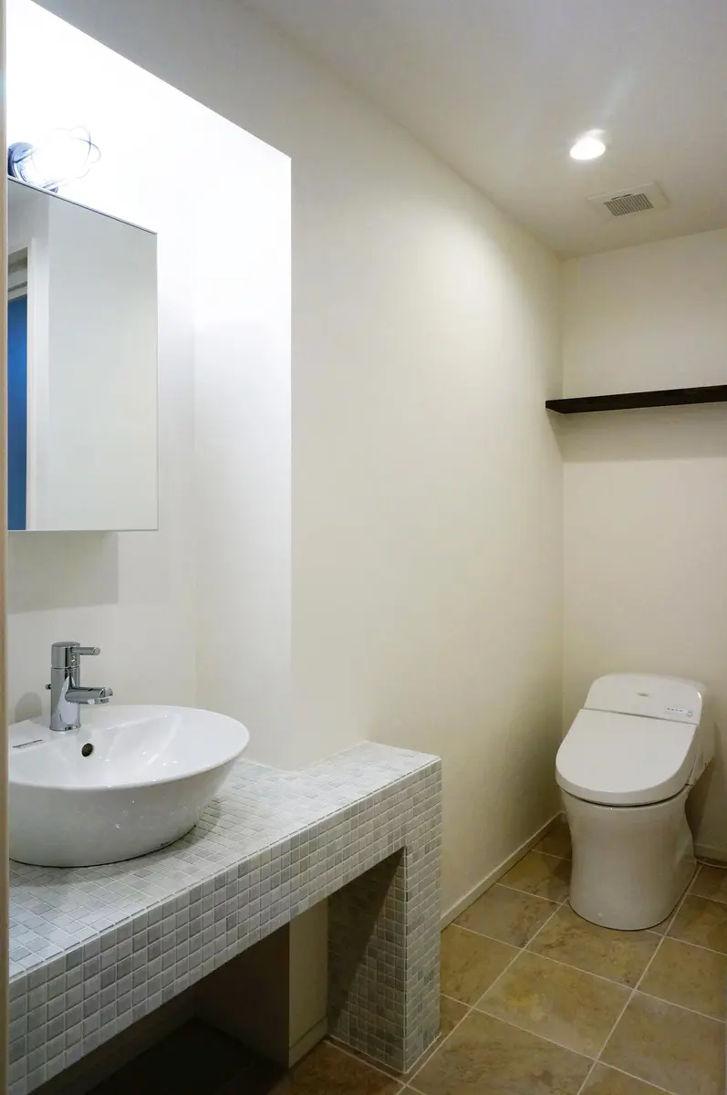 洗面室は洗面台とトイレを一部屋とし、床や洗面台のタイルは明るく優しい印象のものを使うことで、全体として爽やかな空間になりました。
