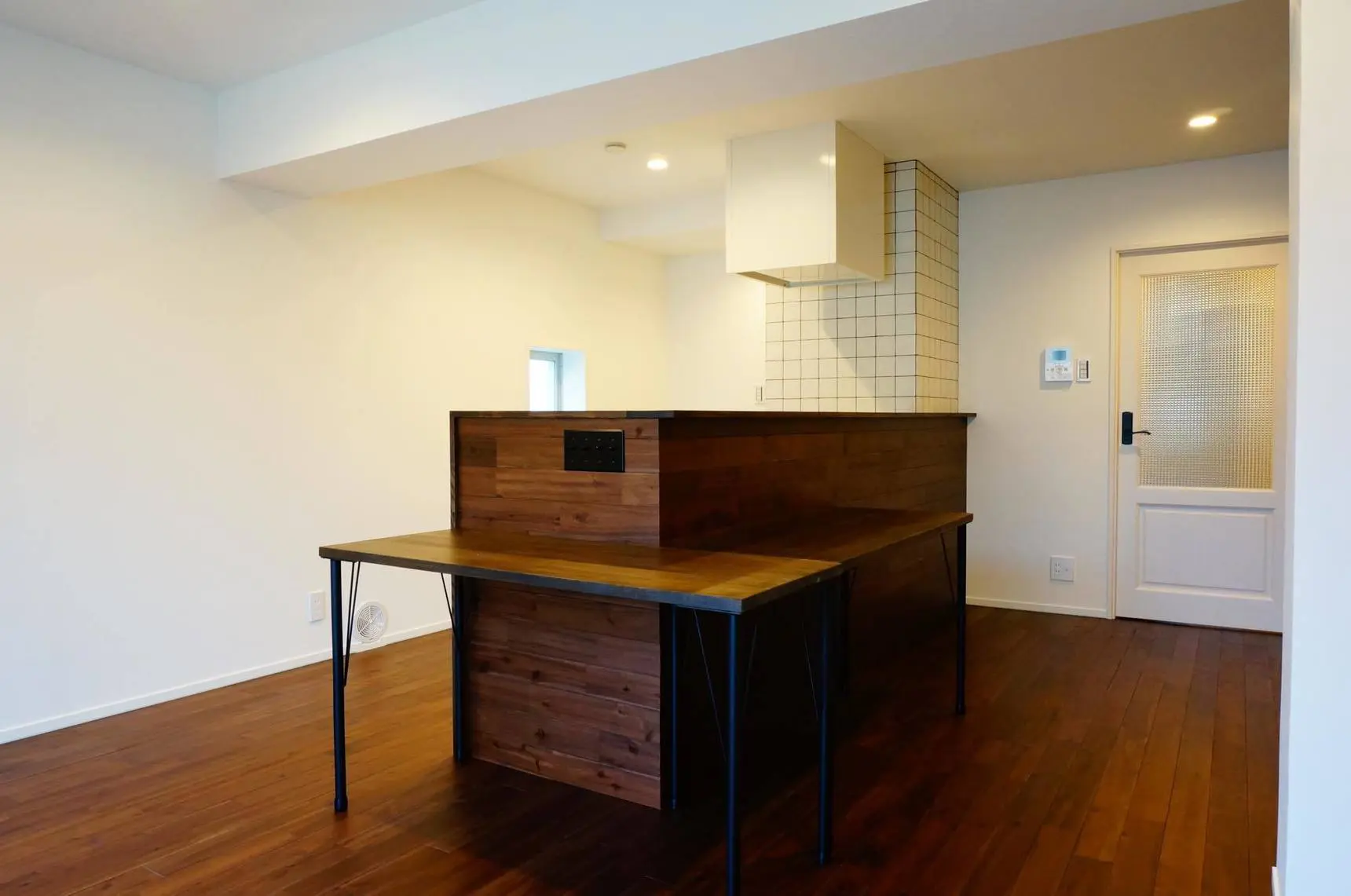内装・プランに合わせて造作した2つの机は置き方を組み合わせることで、デスク・ダイニングテーブル・ダイニングカウンターなどとなり、様々な生活のシーンに対応します。