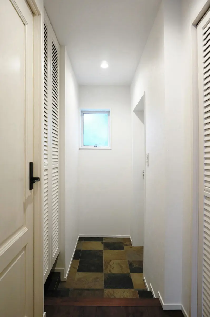 黒と白の内装はスタイリッシュになり過ぎる傾向がありますが、無垢フローリングの色ムラ、金物のマットな質感、優しいデザインの建具、微妙な揺らぎのあるタイルなどを選定することで、少し西欧の田舎の家のようなノスタルジックな印象を与えています。