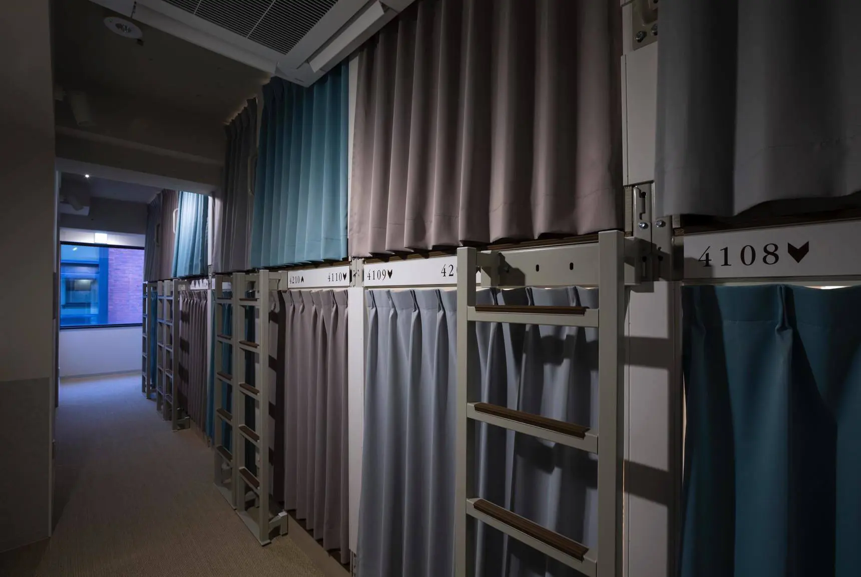 2階から6階までは宿泊室です。6階のみ、グループで泊まれるようカーテンで仕切ることができます。