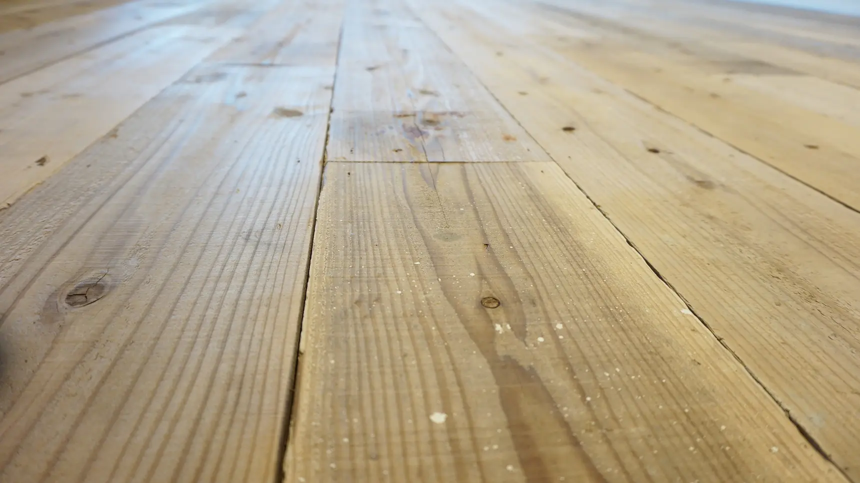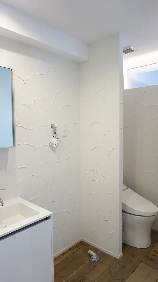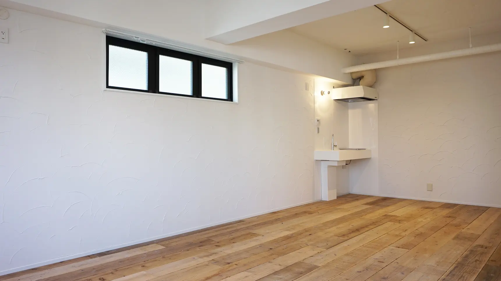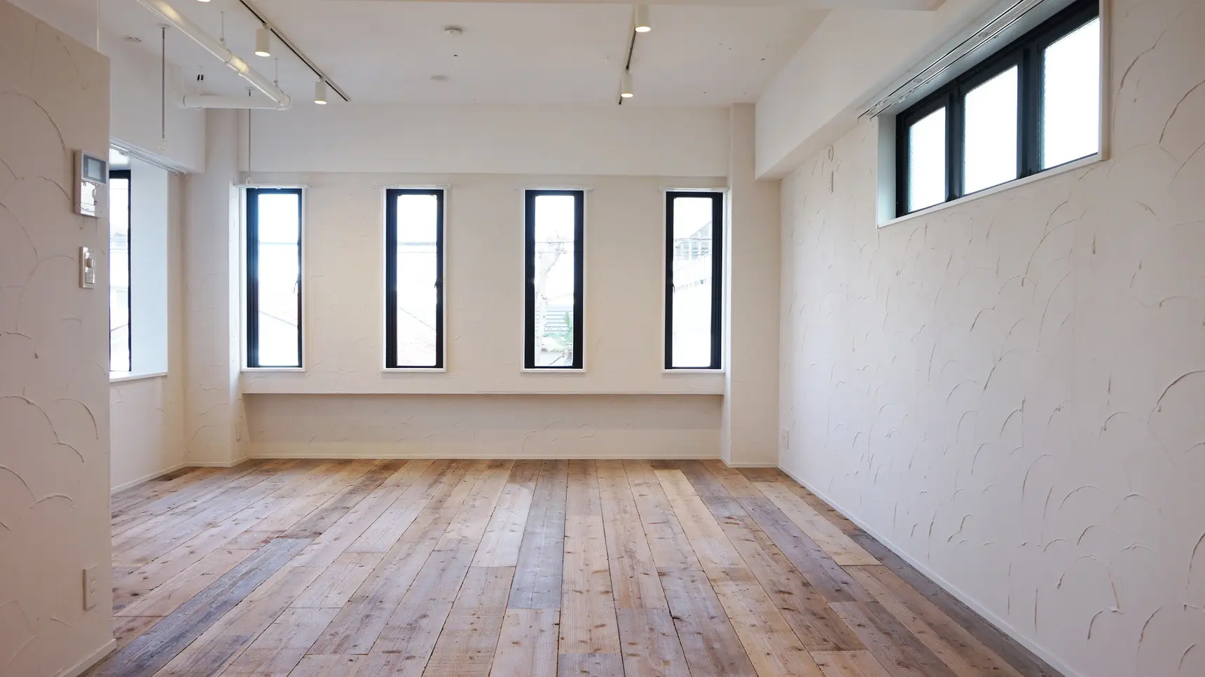 天井はコンクリート躯体を現し塗装にし、視線に近い壁は柔らかな表情の左官仕上げ、床は荒々しい印象の現場仕様済みの杉板足場板を貼っています。