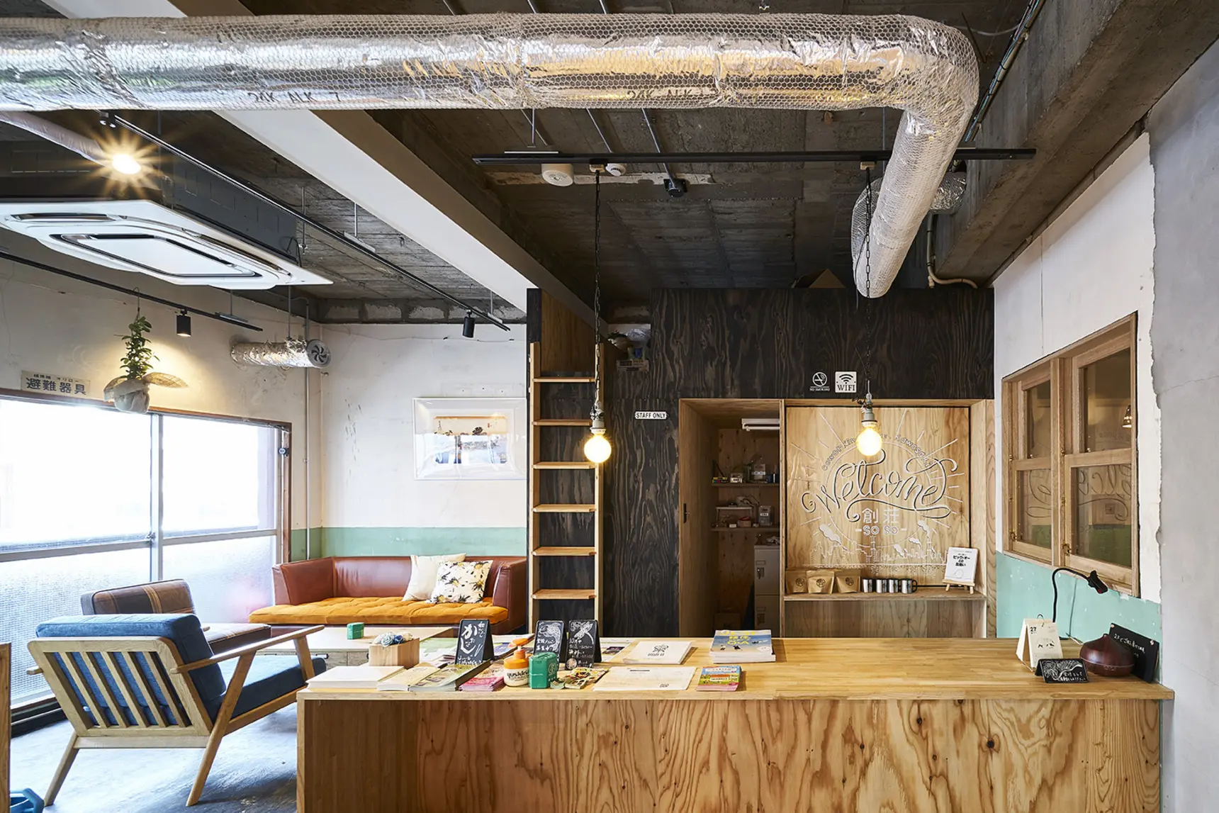 川崎を拠点とするサニーワンステップさんが運営するコワーキングスペース「創荘」の設計・施工・家具デザイン造作・家具コーディネート調達・植物コーディネート調達・ロゴデザインを